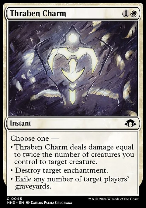 Choose one — • Thraben Charm deals damage equal to twice the number of creatures you control to target creature. • Destroy target enchantment. • Exile any number of target players' graveyards.