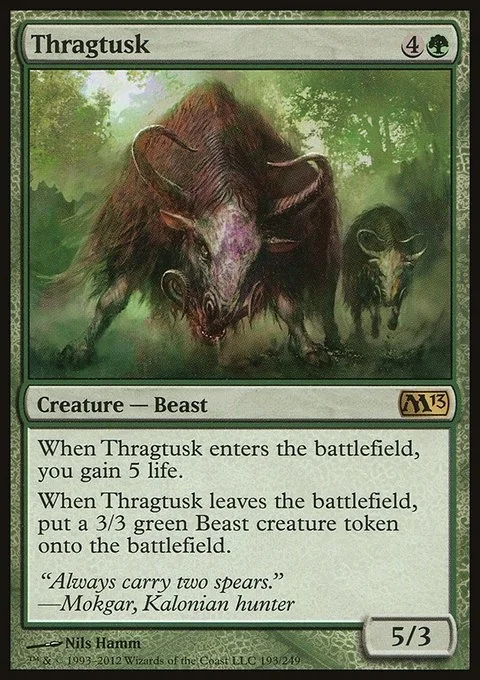 When Thragtusk enters the battlefield, you gain 5 life. When Thragtusk leaves the battlefield, create a 3/3 green Beast creature token.