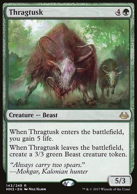 When Thragtusk enters the battlefield, you gain 5 life. When Thragtusk leaves the battlefield, create a 3/3 green Beast creature token.