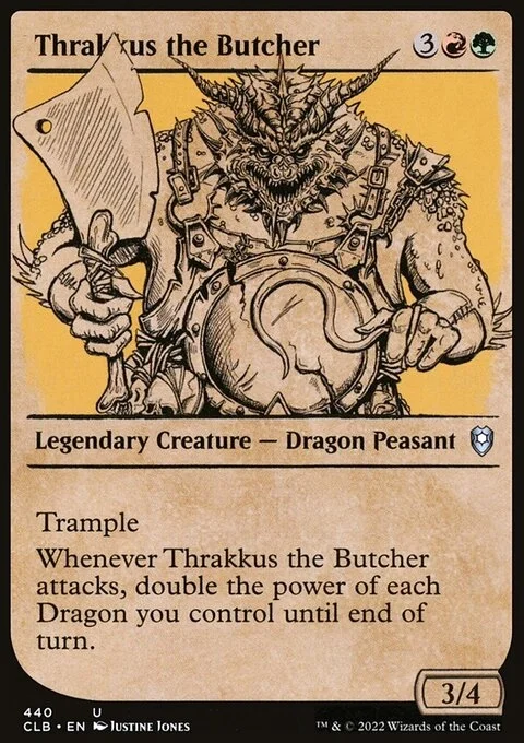 Trample Whenever Thrakkus the Butcher attacks, double the power of each Dragon you control until end of turn.