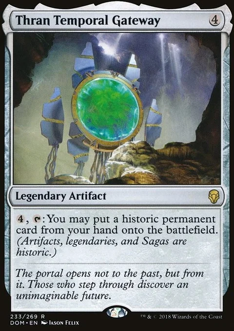 {4}, {T}: You may put a historic permanent card from your hand onto the battlefield. (Artifacts, legendaries, and Sagas are historic.)