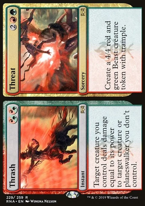 Thrash Target creature you control deals damage equal to its power to target creature or planeswalker you don't control. Threat Create a 4/4 red and green Beast creature token with trample.