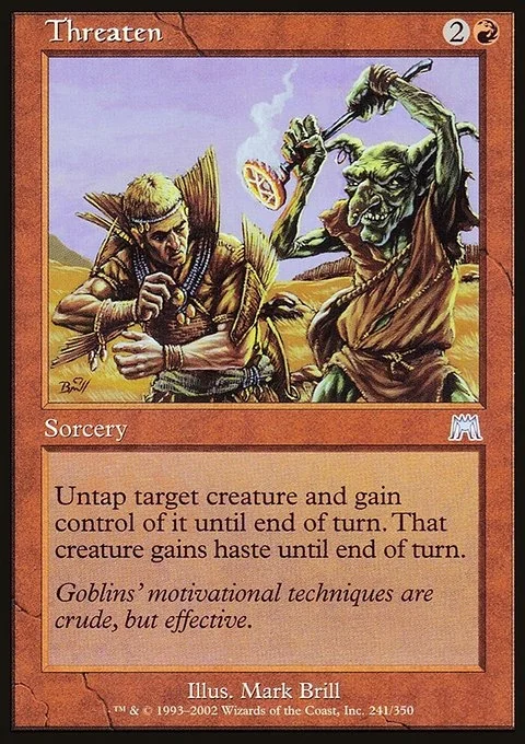 Untap target creature and gain control of it until end of turn. That creature gains haste until end of turn. (It can attack and {T} this turn.)