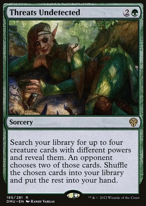 Search your library for up to four creature cards with different powers and reveal them. An opponent chooses two of those cards. Shuffle the chosen cards into your library and put the rest into your hand.