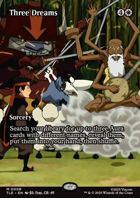 Search your library for up to three Aura cards with different names, reveal them, put them into your hand, then shuffle.