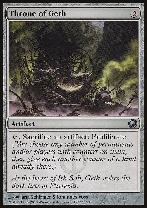 {T}, Sacrifice an artifact: Proliferate. (Choose any number of permanents and/or players, then give each another counter of each kind already there.)