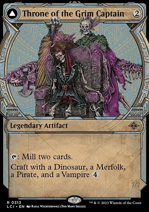 Throne of the Grim Captain {T}: Mill two cards. Craft with a Dinosaur, a Merfolk, a Pirate, and a Vampire {4} ({4}, Exile this artifact, Exile the four from among permanents you control and/or cards in your graveyard: Return this card transformed under its owner's control. Craft only as a sorcery.) The Grim Captain Menace, trample, lifelink, hexproof Whenever The Grim Captain attacks, each opponent sacrifices a nonland permanent. Then you may put an exiled creature card used to craft The Grim Captain onto the battlefield under your control tapped and attacking.
