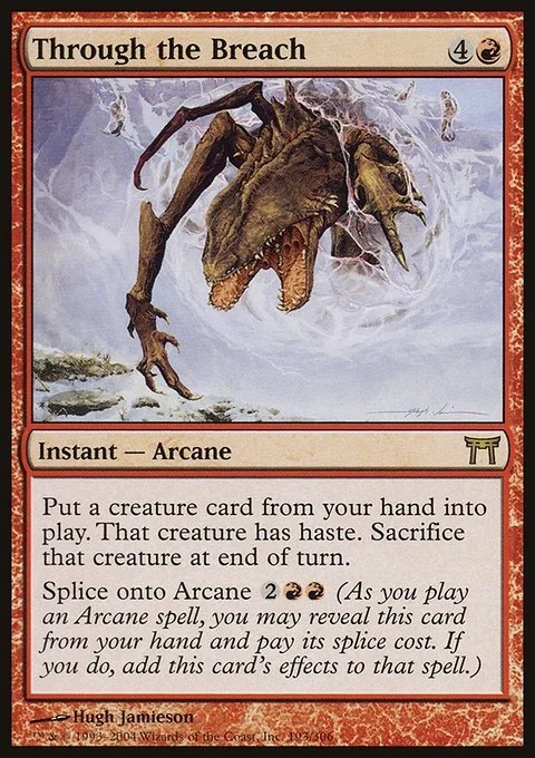 You may put a creature card from your hand onto the battlefield. That creature gains haste. Sacrifice that creature at the beginning of the next end step. Splice onto Arcane {2}{R}{R} (As you cast an Arcane spell, you may reveal this card from your hand and pay its splice cost. If you do, add this card's effects to that spell.)