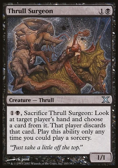 {1}{B}, Sacrifice Thrull Surgeon: Look at target player's hand and choose a card from it. That player discards that card. Activate only as a sorcery.