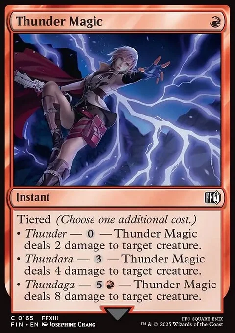 Tiered (Choose one additional cost.) • Thunder — {0} — Thunder Magic deals 2 damage to target creature. • Thundara — {3} — Thunder Magic deals 4 damage to target creature. • Thundaga — {5}{R} — Thunder Magic deals 8 damage to target creature.