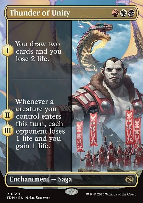 (As this Saga enters and after your draw step, add a lore counter. Sacrifice after III.) I — You draw two cards and you lose 2 life. II, III — Whenever a creature you control enters this turn, each opponent loses 1 life and you gain 1 life.