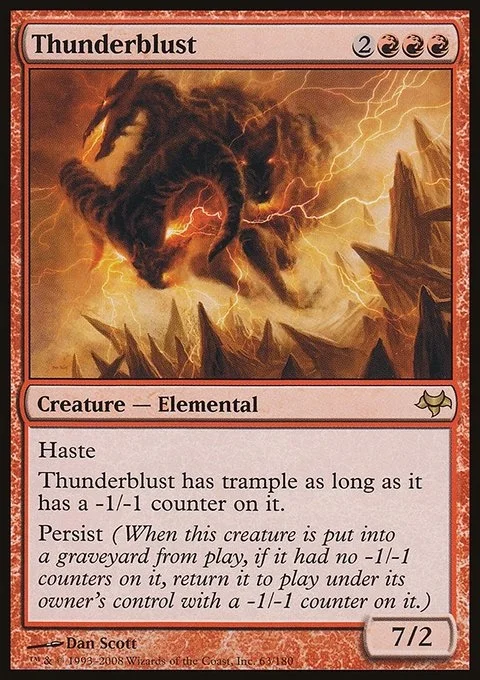 Haste Thunderblust has trample as long as it has a -1/-1 counter on it. Persist (When this creature dies, if it had no -1/-1 counters on it, return it to the battlefield under its owner's control with a -1/-1 counter on it.)