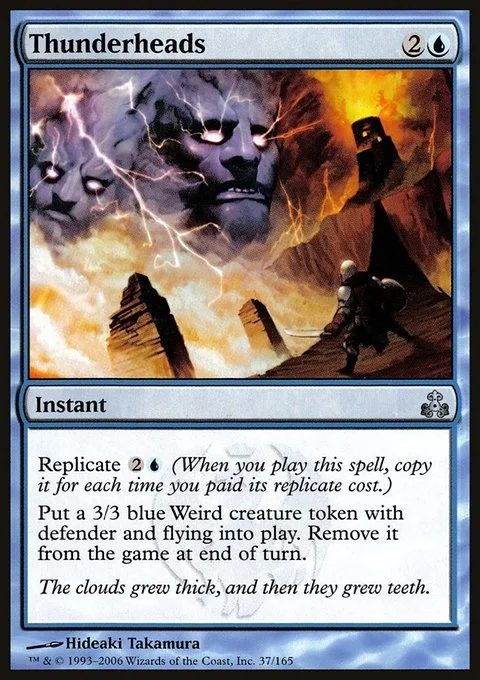 Replicate {2}{U} (When you cast this spell, copy it for each time you paid its replicate cost.) Create a 3/3 blue Weird creature token with defender and flying. Exile it at the beginning of the next end step.