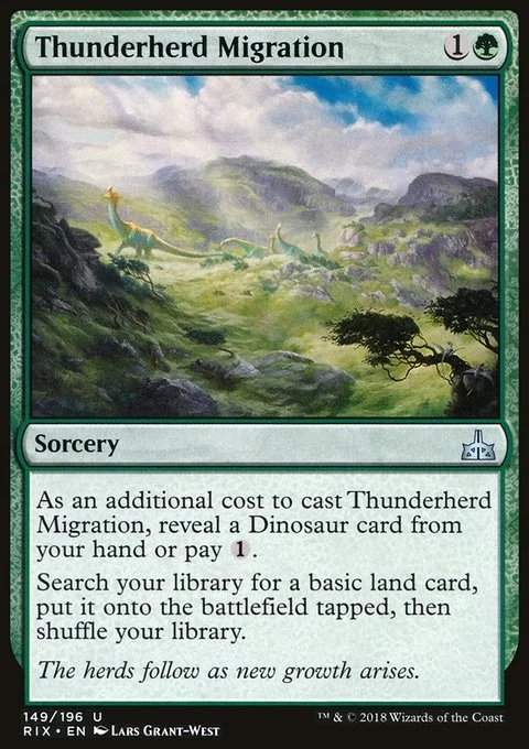 As an additional cost to cast this spell, reveal a Dinosaur card from your hand or pay {1}. Search your library for a basic land card, put it onto the battlefield tapped, then shuffle.