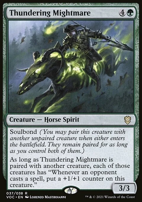 As long as Thundering Mightmare is paired with another creature, each of those creatures has "Whenever an opponent casts a spell, put a +1/+1 counter on this creature."
