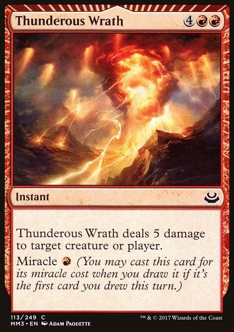 Thunderous Wrath deals 5 damage to any target. Miracle {R} (You may cast this card for its miracle cost when you draw it if it's the first card you drew this turn.)