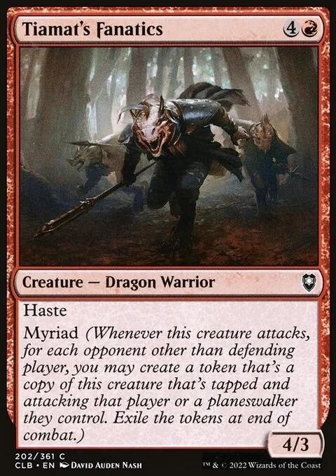 Haste Myriad (Whenever this creature attacks, for each opponent other than defending player, you may create a token copy that's tapped and attacking that player or a planeswalker they control. Exile the tokens at end of combat.)