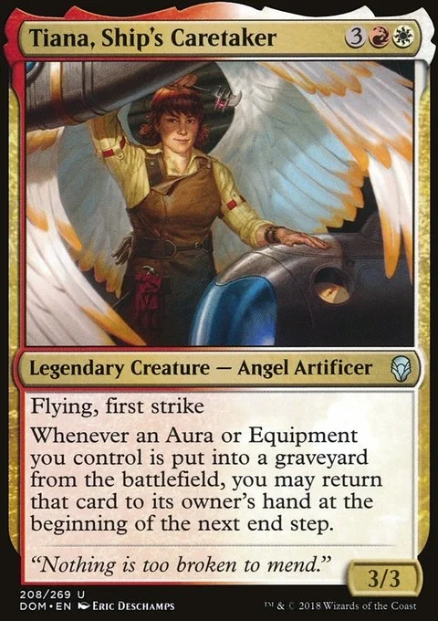 Flying, first strike Whenever an Aura or Equipment you control is put into a graveyard from the battlefield, you may return that card to its owner's hand at the beginning of the next end step.