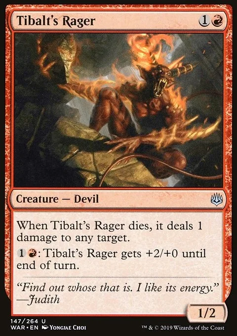 When Tibalt's Rager dies, it deals 1 damage to any target. {1}{R}: Tibalt's Rager gets +2/+0 until end of turn.
