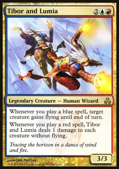 Whenever you cast a blue spell, target creature gains flying until end of turn. Whenever you cast a red spell, Tibor and Lumia deals 1 damage to each creature without flying.