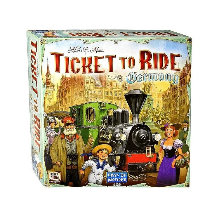 Ticket to Ride: Germany is a standalone game in the Ticket to Ride series. Over the course of the game, players collect cards in order to then claim routes on the game board between two cities. Ideally the players create a network of routes that connect the cities showing on their secret ticket cards. Players score points both for claiming routes and for completing tickets, with incomplete tickets counting against a player's score. In addition to scoring points for tickets, whenever a player places a route on the board, they claim a passenger from the two cities that form the endpoints for that route (assuming that the passengers have not already been claimed). At the end of the game, whoever has the most passengers of each of the six colors scores 20 points for that color; whoever has the secondmost passengers in a color scores 10 points. Whoever has the most points at the end of the game wins. Ticket to Ride: Germany combines most of Zug um Zug: Deutschland and the Deutschland 1902 expansion in one box. Zug um Zug: Deutschland, published solely for the German and Austrian market, consisted of the same map as Ticket to Ride: Märklin, but ZuZ:D didn't include the passenger mechanism from Märklin in which players scored additional points by moving passengers from city to city. The Deutschland 1902 expansion introduced a different method of scoring passengers, and that method is now present in this collection.