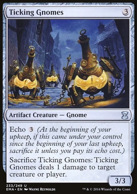 Echo {3} (At the beginning of your upkeep, if this came under your control since the beginning of your last upkeep, sacrifice it unless you pay its echo cost.) Sacrifice Ticking Gnomes: It deals 1 damage to any target.