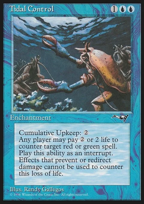 Cumulative Upkeep: 2Any player may pay 2 or 2 life to counter target red or green spell. Play this ability as an interrupt. Effects that prevent or redirect damage cannot be used to counter this loss of life.