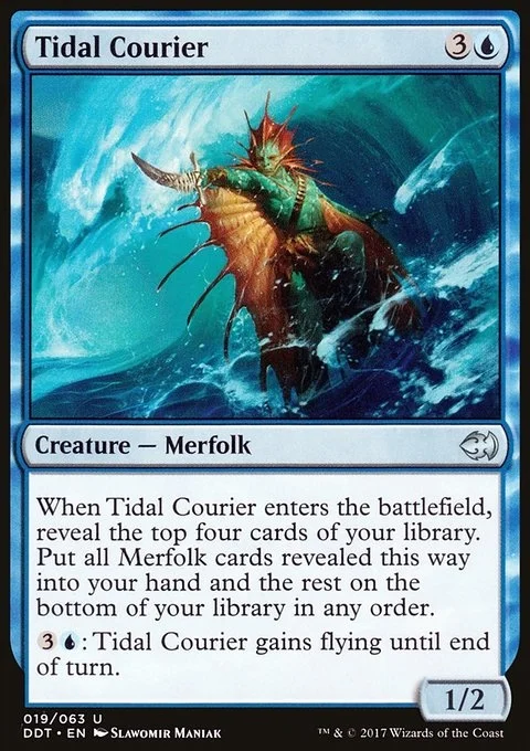 When Tidal Courier enters the battlefield, reveal the top four cards of your library. Put all Merfolk cards revealed this way into your hand and the rest on the bottom of your library in any order. {3}{U}: Tidal Courier gains flying until end of turn.