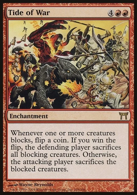 Whenever one or more creatures block, flip a coin. If you win the flip, each blocking creature is sacrificed by its controller. If you lose the flip, each blocked creature is sacrificed by its controller.