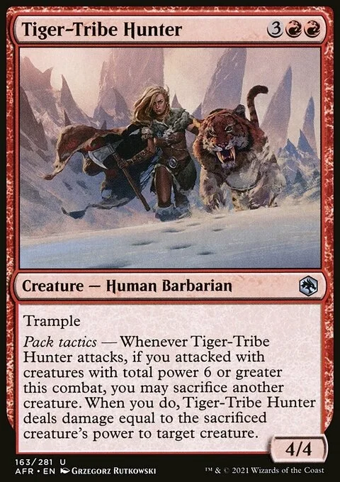 Pack tactics — Whenever Tiger-Tribe Hunter attacks, if you attacked with creatures with total power 6 or greater this combat, you may sacrifice another creature. When you do, Tiger-Tribe Hunter deals damage equal to the sacrificed creature's power to target creature.