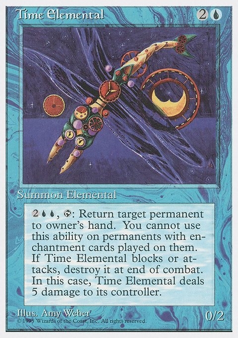 2UU, T: Return target permanent to owner’s hand. You cannot use this ability on permanents with enchantment cards played on them. If Time Elemental blocks or attacks, destroy it at end of combat. In this case, Time Elemental deals 5 damage to its controller.