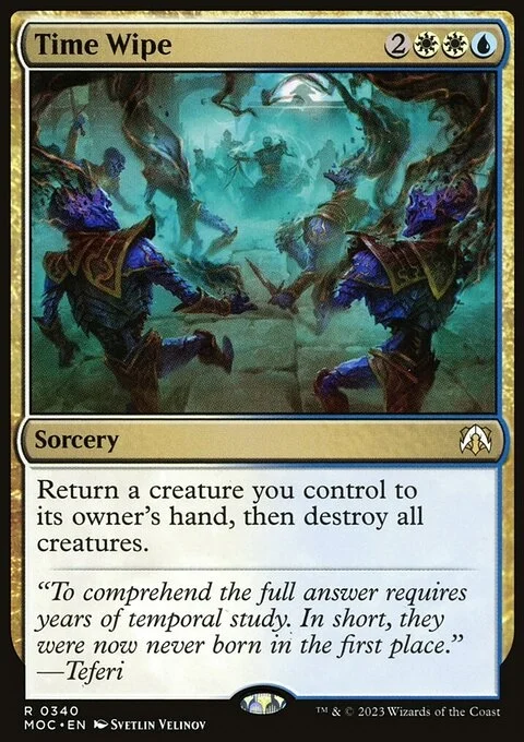 Return a creature you control to its owner's hand, then destroy all creatures.