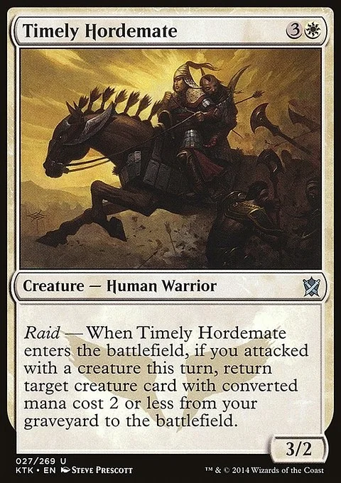 Raid — When Timely Hordemate enters the battlefield, if you attacked this turn, return target creature card with converted mana cost 2 or less from your graveyard to the battlefield.