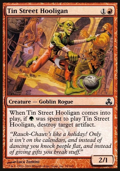 When Tin Street Hooligan enters, if {G} was spent to cast it, destroy target artifact.