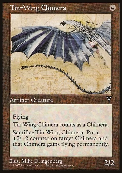 FlyingTin-Wing Chimera counts as a Chimera.Sacrifice Tin-Wing Chimera: Put a +2/+2 counter on target Chimera and that Chimera gains flying permanently.