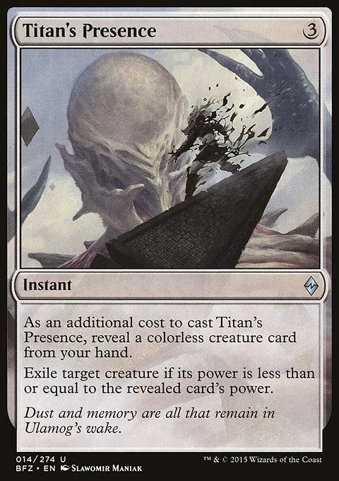 As an additional cost to cast this spell, reveal a colorless creature card from your hand. Exile target creature if its power is less than or equal to the revealed card's power.