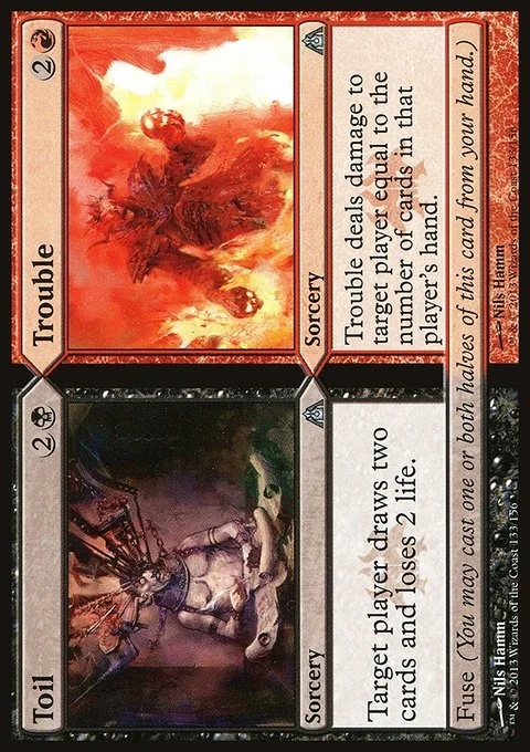 Toil Target player draws two cards and loses 2 life. Fuse (You may cast one or both halves of this card from your hand.) Trouble Trouble deals damage to target player equal to the number of cards in that player's hand. Fuse (You may cast one or both halves of this card from your hand.)