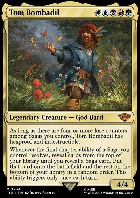 As long as there are four or more lore counters among Sagas you control, Tom Bombadil has hexproof and indestructible.