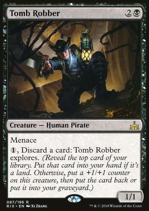 Menace {1}, Discard a card: Tomb Robber explores. (Reveal the top card of your library. Put that card into your hand if it's a land. Otherwise, put a +1/+1 counter on this creature, then put the card back or put it into your graveyard.)