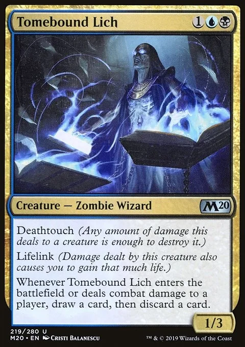 Whenever Tomebound Lich enters the battlefield or deals combat damage to a player, draw a card, then discard a card.