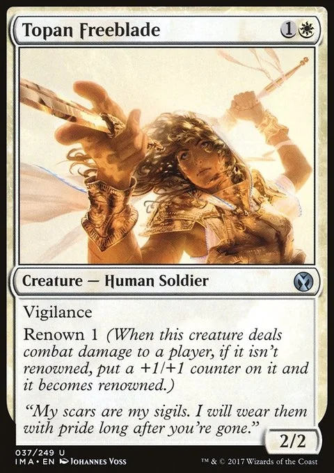 Vigilance (Attacking doesn't cause this creature to tap.) Renown 1 (When this creature deals combat damage to a player, if it isn't renowned, put a +1/+1 counter on it and it becomes renowned.)