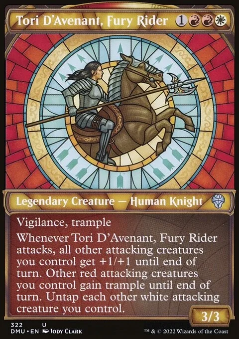 Whenever Tori D'Avenant, Fury Rider attacks, all other attacking creatures you control get +1/+1 until end of turn. Other red attacking creatures you control gain trample until end of turn. Untap each other white attacking creature you control.