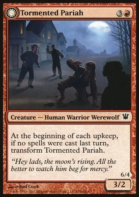 Tormented Pariah At the beginning of each upkeep, if no spells were cast last turn, transform Tormented Pariah. Rampaging Werewolf At the beginning of each upkeep, if a player cast two or more spells last turn, transform Rampaging Werewolf.