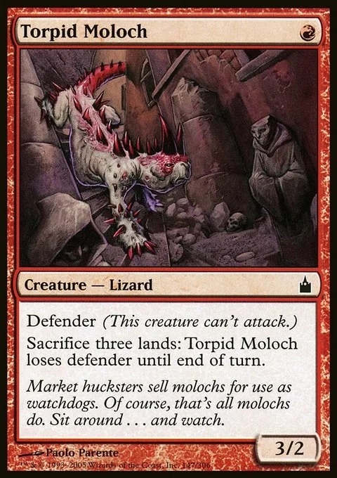 Defender (This creature can't attack.) Sacrifice three lands: Torpid Moloch loses defender until end of turn.