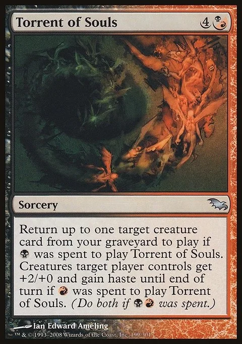 Return up to one target creature card from your graveyard to play if B was spent to play Torrent of Souls. Creatures target player controls get +2/+0 and gain haste until end of turn if R was spent to play Torrent of Souls. (Do both if BR was spent.)