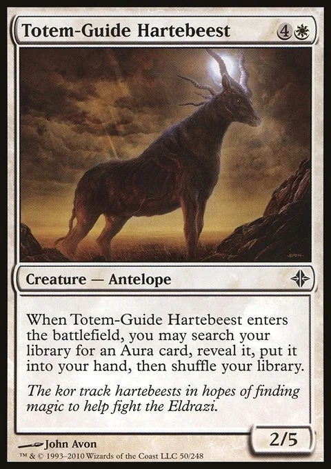 When Totem-Guide Hartebeest enters the battlefield, you may search your library for an Aura card, reveal it, put it into your hand, then shuffle your library.