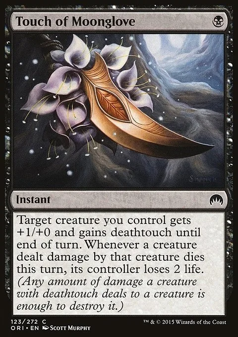Target creature you control gets +1/+0 and gains deathtouch until end of turn. Whenever a creature dealt damage by that creature dies this turn, its controller loses 2 life. (Any amount of damage a creature with deathtouch deals to a creature is enough to destroy it.)
