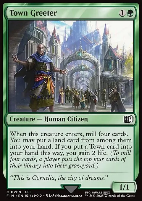 When this creature enters, mill four cards. You may put a land card from among them into your hand. If you put a Town card into your hand this way, you gain 2 life. (To mill four cards, a player puts the top four cards of their library into their graveyard.)