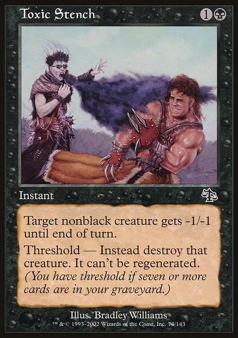 Target nonblack creature gets -1/-1 until end of turn. Threshold — If seven or more cards are in your graveyard, instead destroy that creature. It can't be regenerated.