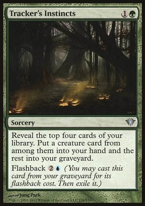 Reveal the top four cards of your library. Put a creature card from among them into your hand and the rest into your graveyard. Flashback {2}{U} (You may cast this card from your graveyard for its flashback cost. Then exile it.)